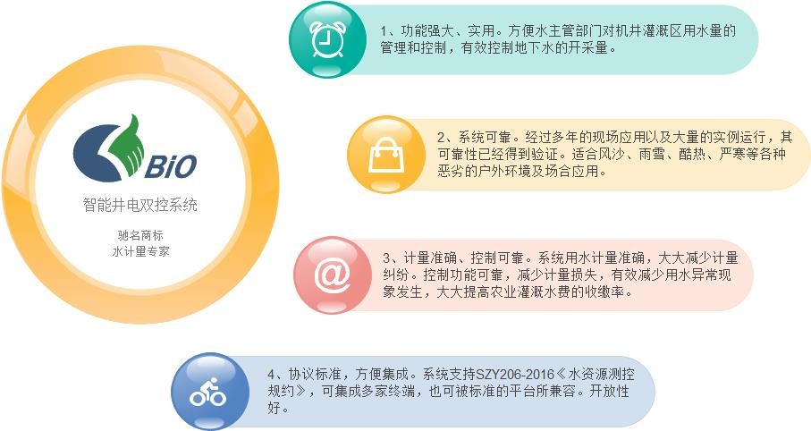 智能井电双控系统,是指利用无线通讯技术、物联网技术、控制技术、流量测量技术及先进的控制算法和计量转换控制等,实现对灌区内的机电井进行灌溉取水计量、费用计算及用水控制的智能化系统。该系统是水利部门对农业灌溉进行总量控制、定额管理、费转税管理的基础设施,是农业水价改革的基础、是地下水超采治理、和农业节水增效的有效经济手段。